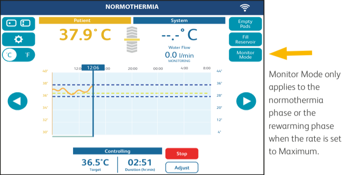 Lets you set upper and lower temperature limits to continuously monitor patients being treated with Normothermia, and alerts or automatically starts therapy when the patient's temperature exceeds the bounds.